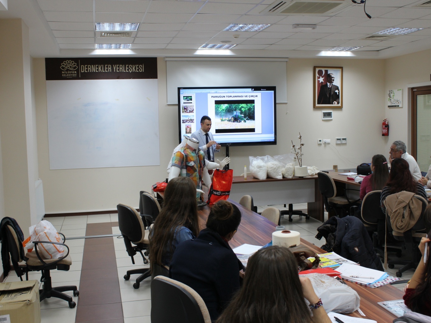 Daha sonra tarladan nihai ürüne kadar pamuk ipliğinin öyküsünü videolarla görsel olarak anlattı. İplik çeşitlerini, open-end ve ring iplikçiliği anlatan Banazılı; Ring ipliğini ve kompakt ipliği anlattı.