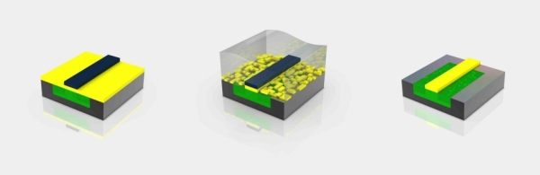 Yapışkan fotorezist, kullanılan çözücü ile yok edilir. Bu adımla birlikte maske tarafından yapılan fotorezist kalıbı (siyah kısım) ortaya çıkar. Fotorezist, kimyasallara aşınmaması adına High-K dielektriği koruma görevini üstlenir. Aşındırılmış fotorezistin kaldırılmasından sonra istenen şekil görünür olur.