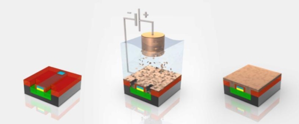 Hazır transistörler artık tamamlanmaya yakındır. Üç delik, Kırmızı renkle görülen yalıtkan katman ile yakılırlar. Bu üç delik, diğer transitörlerle iletişimi sağlamak üzere bakır ya da diğer metaller ile doldurulurlar. Elektro-Kaplama aşamasında waferlar, bakır sülfat solüsyon içerisine sokulurlar. Bakır iyonları, elektro-kaplama adı verilen işlem ile transistörlere dökülürler. Bakır iyonları, pozitif terminalden (anot) negatif terminale (katot) doğru seyahat ederler. Elektro-Kaplama aşamasından sonra Bakır iyonları aynı ince bir Bakır katmanı gibi yerleşirler wafer üzerine.