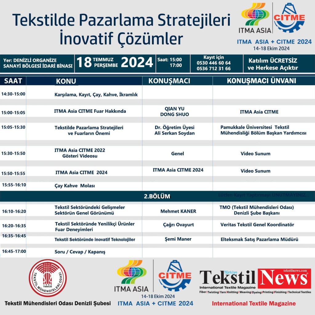 Tekstil Mühendisleri Odası Denizli Şubesi (TMO) ve ITMA ASIA + CITME 2024 Fuarı sponsorluğunda, “Tekstil Sektöründe Başarılı Pazarlama Stratejileri Geliştirme, Uygulama ve Sektördeki Yenilikçi Çözümler” başlıklı konferans 18 Temmuz 2024 Perşembe günü Denizli Organize Sanayi Bölgesi İdari Binası Konferans Salonu’nda gerçekleştirilecek.
