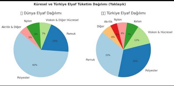 Türkiye’ye geldiğimizde tablo biraz farklılaşıyor: Pamuk %33 ve Polyester %32 neredeyse başa baş gidiyor. Viskon ve diğer hücresel elyaflar %12,