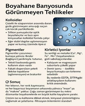 Boyahanelerde leke, abraj ya da renk tutmama sorunları çoğu zaman “makine mi, operatör mü, reçete mi?” sorularına bağlanır. Oysa çoğu defa görünmeyen ama etkisi çok büyük olan mikroskobik düşmanlar iş başındadır: Kolloidler, pigmentler, boyar madde kalıntıları ve kirletici iyonlar. Bu yazı konuyu bilmeyenler ve merak edenler için yazıldı.